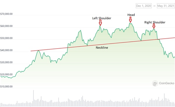 让我们使用 BTC 从 2020 年 11 月到 2021 年 7 月的价格走势来说明技术分析的工作原理。上图举例说明了头肩形态,这是一种潜在的价格走势反转形态,其中任何突破颈线都预示着价格的重大变化。 BTC 的价格在 2021 年 5 月 15 日跌破颈线时从 50,000 美元跌至近 35,000 美元。