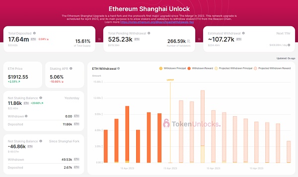 以太坊已在北京时间4月13日6:30成功完成了 Shapella 升级,据TGate.ion Unlock即时数据,升级完成后,截止发文,以太坊净提取为5万枚,在接下来的11小时内,预计提款数量为10.7万枚以太币、当前尚还有52.5万枚以太币处于待提款状态。目前以太坊上的总质押量下降至1764万枚、质押的年化收益率为5.06%。