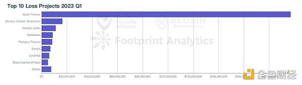 2023 年第一季度,DeFi 类型项目共发生 42 次安全事件,占总事件数量的 68.9% 。DeFi 总损失金额达到了 2.48 亿美元 ,占总损失金额的 84% 。DeFi 为本季度被攻击频次最高、损失金额最多的项目类型。