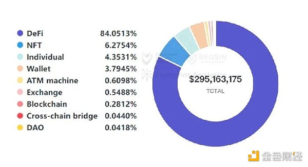 类型损失金额排名第二(1852 万美元),主要来自于 钓鱼事件。排名第三的类型为个人用户,该类别均为钓鱼攻击。损失金额的第四位为钱包攻击事件。从类型上来看,损失金额的第 2-4 位均和用户安全紧密相关。