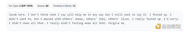 从 3 月 18 日开始至 4 月 4 日,攻击者开始陆续返还资金。期间攻击者通过链上信息进行道歉,称自己“搅乱了别人的钱,别人的工作,别人的生活”并请求大家的原谅。
