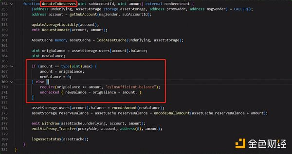 在本次攻击中,EtGate.ion 合约的 donateToReserves 函数没有正确检查用户实际持有的代币数量和捐赠后用户账本的健康状态。攻击者利用这个漏洞,捐赠了 1 亿个 eDAI,而实际上攻击者只质押了 3000 万个 DAI。