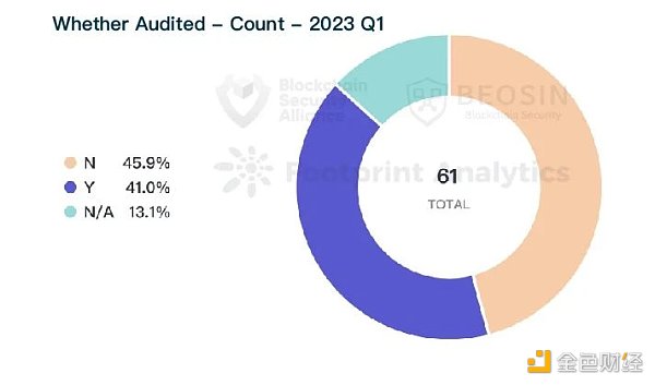 2023 年第一季度遭到攻击的项目中,除开 8 个无法用是否审计衡量的事件(如一些个人用户遭受的钓鱼攻击等),在剩下被攻击的项目中,接受过审计的有 28 个,未接受审计的有 25 个。