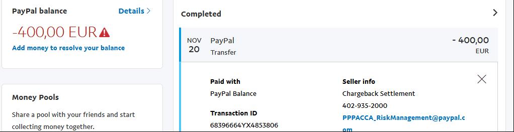 当时在Paypal交易是因为不太信任paypal,所以收到后马上把Paypal钱提到德意志银行。后来付款人做了一个charge back,撤回付款,Paypal我的账户余额是-400欧元。