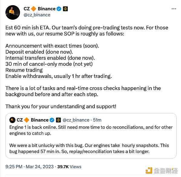 CZ在其社交平台表示,现货交易预计 60 分钟可恢复,团队正在进行交易前测试。