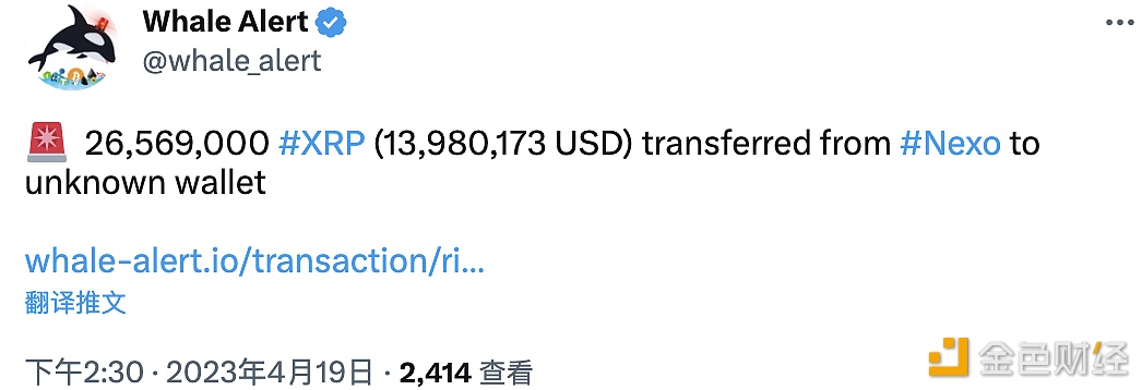 数据显示, 26,569,000 XRP (价值约13,980,173美元) 从Nexo转移到未知钱包。