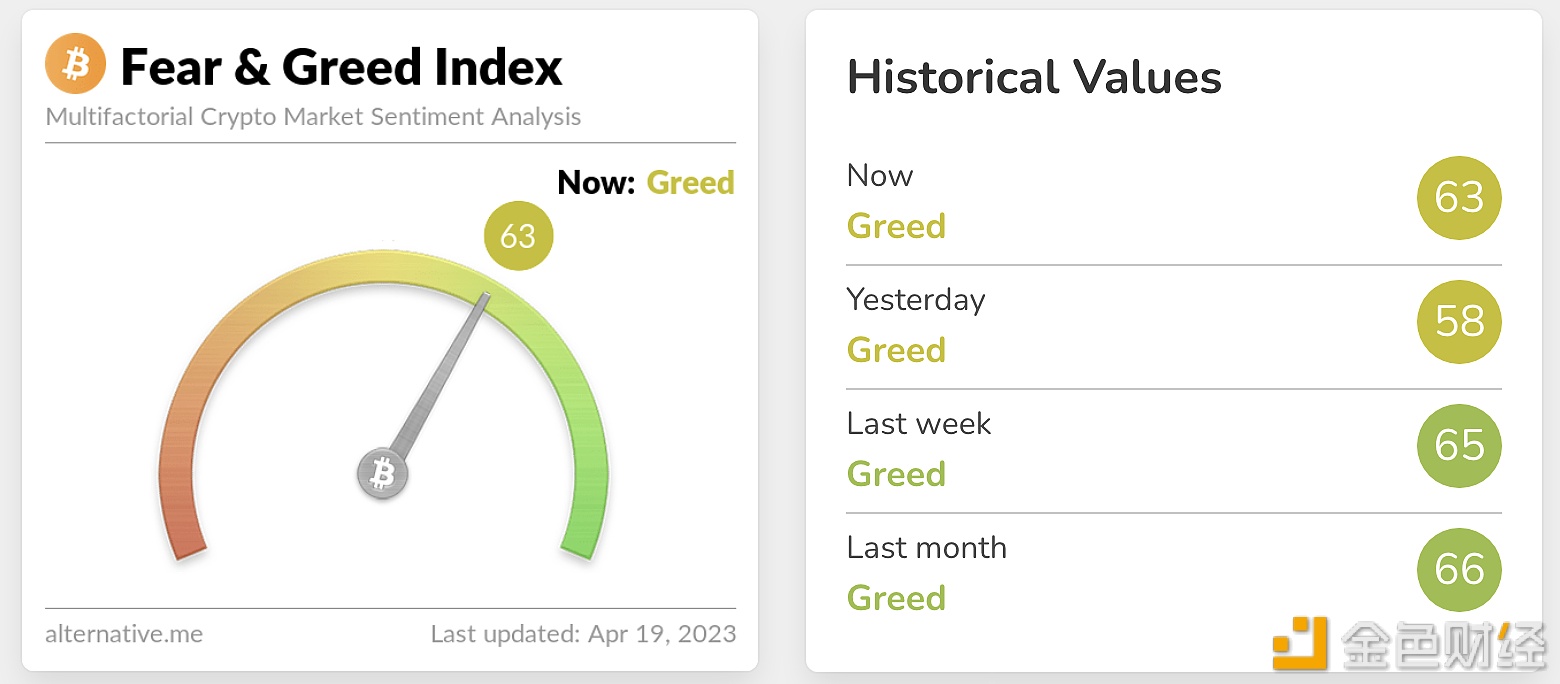 今日恐慌与贪婪指数为63(昨日为58),贪婪程度较昨日大幅下降上升,等级仍为贪婪。 注:恐慌指数阈值为0-100,包含指标:波动性(25%)+市场交易量(25%)+社交媒体热度(15%)+市场调查(15%)+比特币在整个市场中的比例(10%)+谷歌热词分析(10%)。