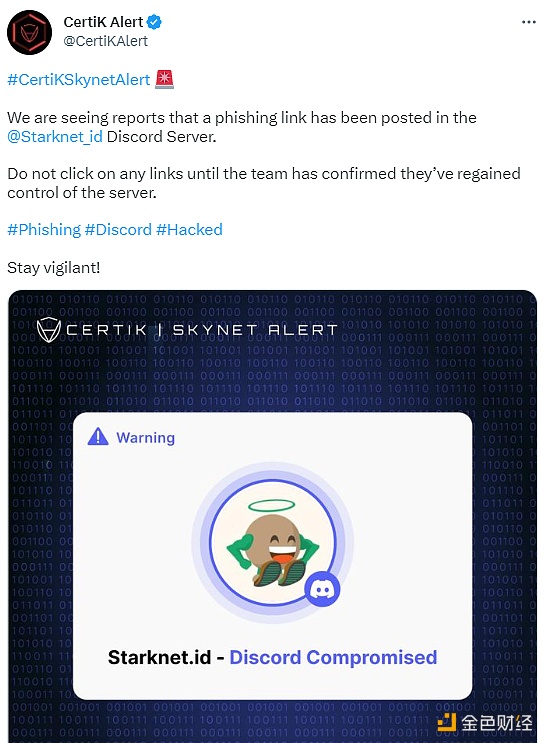 消息,据CertiK监测,Starknet.id项目Discord服务器已被入侵,黑客发布了网络钓鱼链接。在团队重获其服务器的控制权之前,请勿点击任何链接。