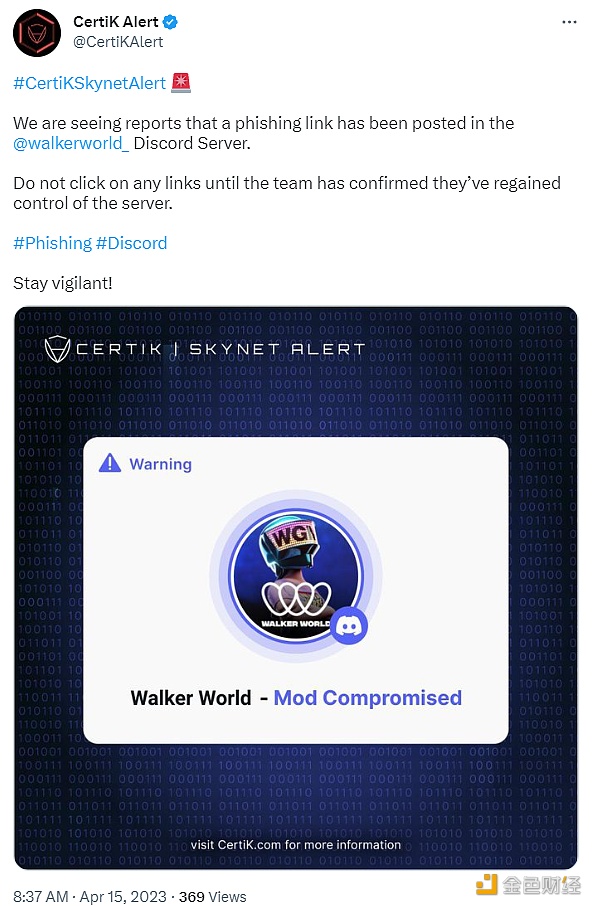 据CertiK监测,WalkerWorld项目Discord服务器已被入侵,黑客发布了网络钓鱼链接。在团队重获其服务器的控制权之前,请勿点击任何链接。