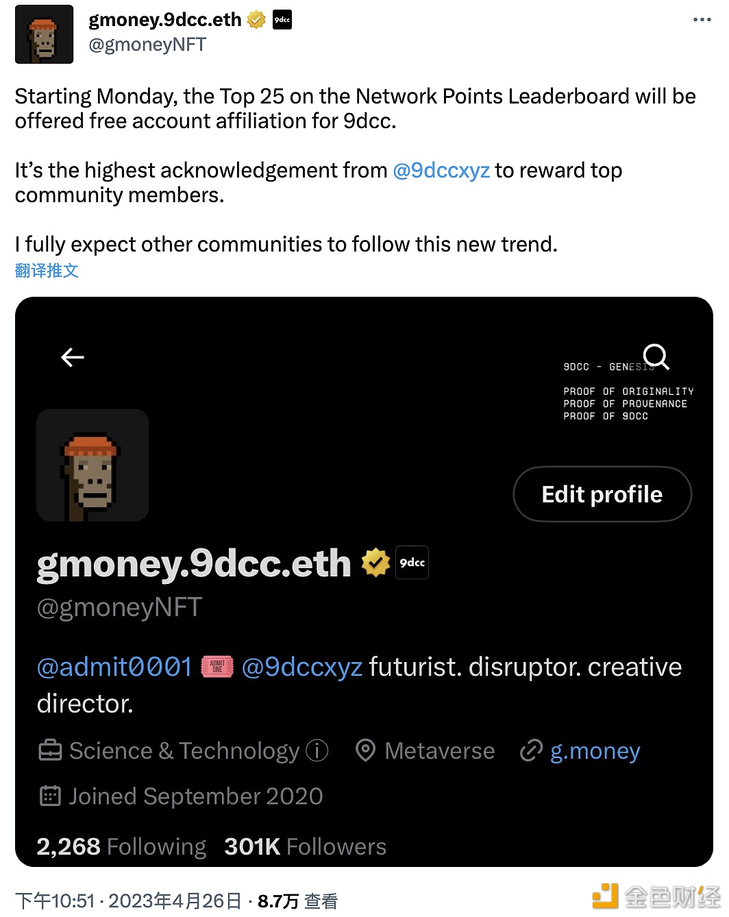 据gmoney.9dcc.eth在社交媒体上发文表示,“网络积分排行榜的前25名将获得9dcc的免费帐户隶属关系。这是最高的认可,奖励给社区成员。并希望其他社区能够遵循这一新趋势。”