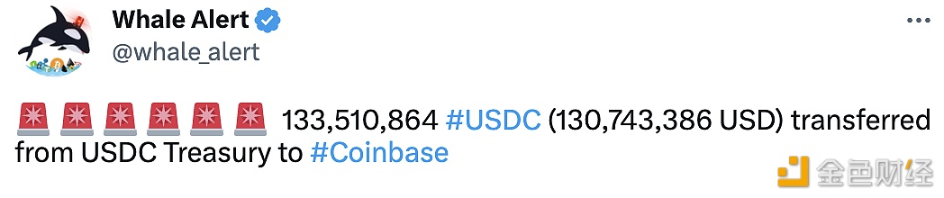 133,510,864 USDC(价值约130,743,386美元)从USDC Treasury转移到Coinbase。