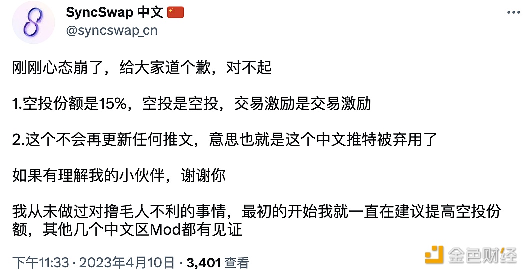 4月10日消息,SyncSwap 中文号及其运营者发布项目空投相关信息,其中提到 TGate.ion 分配中空投与交易激励是分开的,其中空投份额为总量的 15%,但目前官方的 TGate.ion 经济学文档已经设置权限而无法查看。 随后,该账号表示将不会再更新任何推文,即该中文推特被弃用。