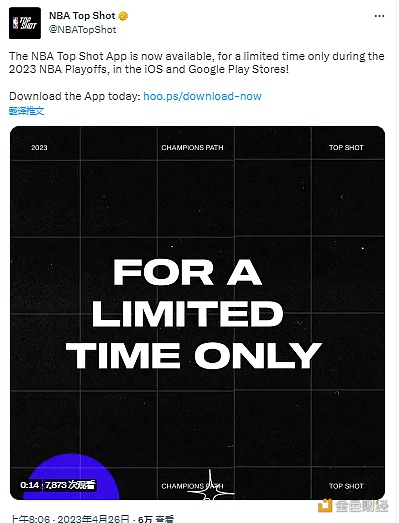 4月26日消息,NBA Top Shot 发推称,NBA Top Shot App 将限时上架 Apple Store 与谷歌应用商店,时间仅在 2023 年 NBA 季后赛期间。