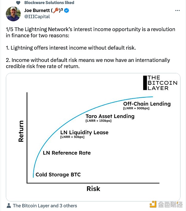 BlockwareTeam首席分析师兼产品经理 Joe Burnett 在社交媒体上表示,闪电网络的利息收入机会是一场金融革命,原因有二: 1. 闪电网络提供没有违约风险的利息收入。2. 没有违约风险的收入意味着我们现在拥有国际可信的无风险回报率。2022 年,闪电网络为节点运营商带来了约 200 万美元的费用。随着区块空间保持固定,比特币的采用继续扩大,随着闪电网络成为全球可信赖的支付网络,交易量激增,这种情况将继续增长。