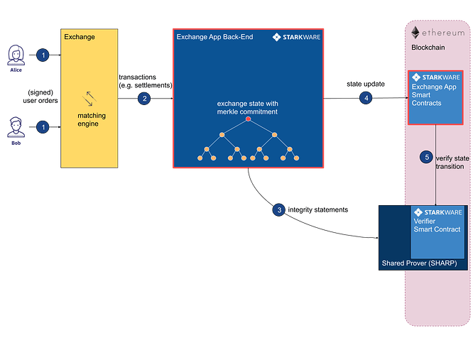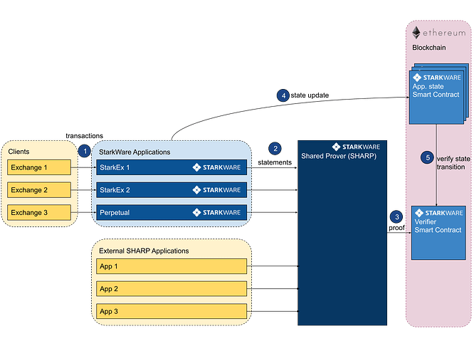 打包交易:链下服务器处理客户请求,将多个交易组合成一个“批次”,供 StarkEx 处理。 确认交易和更新状态:链下服务器确认交易合法,并以被压缩后的哈希形式更新系统状态。 为交易生成证明:完成上述流程后,SHARP 会为交易生成 STARK 证明以确认交易的有效性。然后将证明和更新发送到链上 Verifier 智能合约,以确保交易的完整性。 链上验证证明:一旦STARK证明被验证,状态更新被提交并结算回以太坊主网。所有交易都是在链外处理和验证的,而其完整性的证明是在链上验证的。SHARP 是一个共享证明者,它同时为多个 StarkEx 客户/应用提供证明生成服务——生成计算完整性声明的证明。