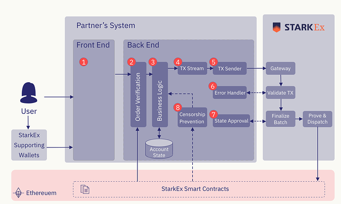 如下图所示,StarkEx 系统旨在接受来自合作伙伴后端的用户交易。这些交易随后由 StarkEx 系统进行批处理和处理。结合前面智能合约和后端的介绍,整个 StarkEx 处理交易的过程和职责分工概述如下。