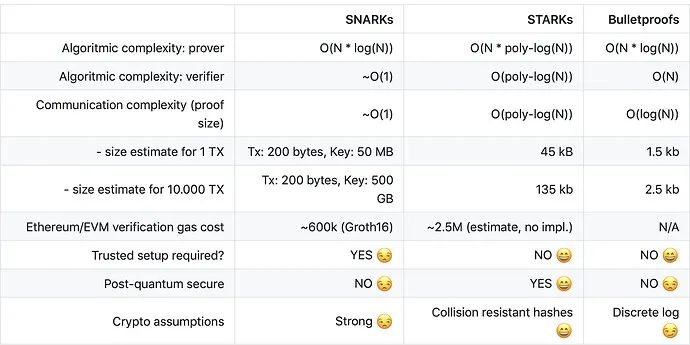 总结一下,相比 SNARK,STARK 更安全,平均验证时间和证明大小将随着验证规模扩大而降低,缺点在于初始证明尺寸更大,因此更适合大规模应用。