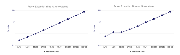 在 80 比特的安全级,STARK 每 12288 次哈希调用的证明者执行时间为 1 秒,得 12288次/S;而每 98304 次哈希调用需要 10 秒,得 9830次/S,因此,我们可以知道 STARK 的证明时间和哈希调用基本呈近似线性关系。如下图所示
