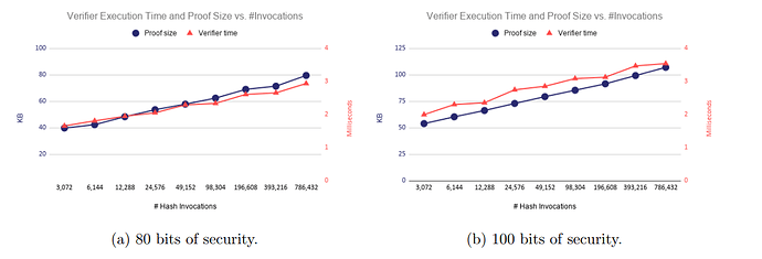 左图可以看出,当哈希调用从 3072 增加到 49152,验证时间从 40 毫秒增加到 60 毫秒。而当哈希调用从 49152 增加到 786432,验证时间仅从 60 毫秒增加到 80 毫秒。证明大小同理。因此,我们可得知,哈希调用次数越多,平均验证时间越短,平均证明大小也会更小(调用哈希生成哈希值/证明)。