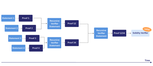 任何通用的、简洁的知识系统的证明/论证(特别是STARKs) 都可以用来递增地验证计算。这意味着一个计算可以产生一个证明,以证明该计算的前一个实例的正确性,这个概念被非正式地称为 “递归证明组合"或者"递归STARKs”。