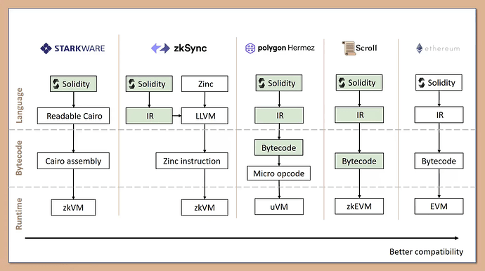StarkNet 没有和 Hermez 和 Scroll 一样针对以太坊操作码做 ZK 电路,而是自己做了一套更加 ZK 友好的汇编语言、AIR(代数中间表示) 以及高级语言 Cairo。