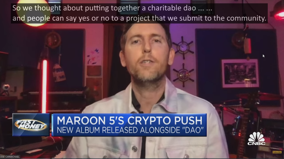 紧接着,YellowHeart 趁热打铁,在 2021 年 6 月又为当红乐队 Maroon 5 推出了史上第一个粉丝专属的 DAO(去中心化自治组织),同样是通过发行 NFT 的方式召集粉丝并募集资金。NFT 收藏者有权参加专属的线下音乐会,听到未发行的额外曲目,获得艺术品,或者是投票决定乐队的慈善行为。